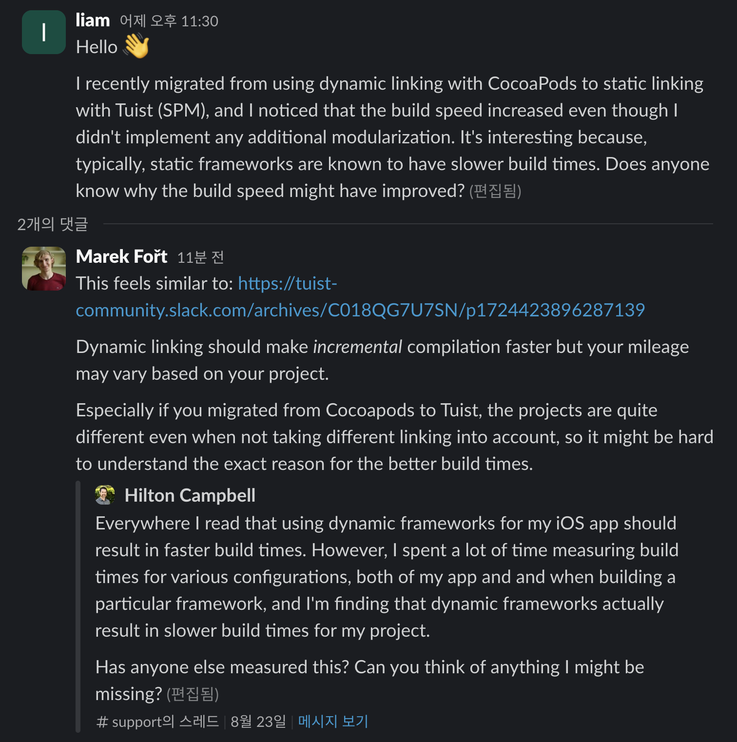 한편 Tuist Cache를 사용하지 않는 경우도 clean build 23~31%, rebuild 28% 이상의 빌드 속도 향상이 측정되었습니다. 일반적으로 Dynamic Linking의 빌드 속도가 더 빠르다는 것을 고려했을 때 이상하게 느낀 부분이었습니다. Tuist에서 SPM을 받아올 때 어떠한 최적화 과정을 수행하는가? 생각이 들어 Tuist 팀에게 물어봤는데 딱히 그런 것 같지는 않았습니다. (혹시 아시는 분 계시면 알려주세요!)