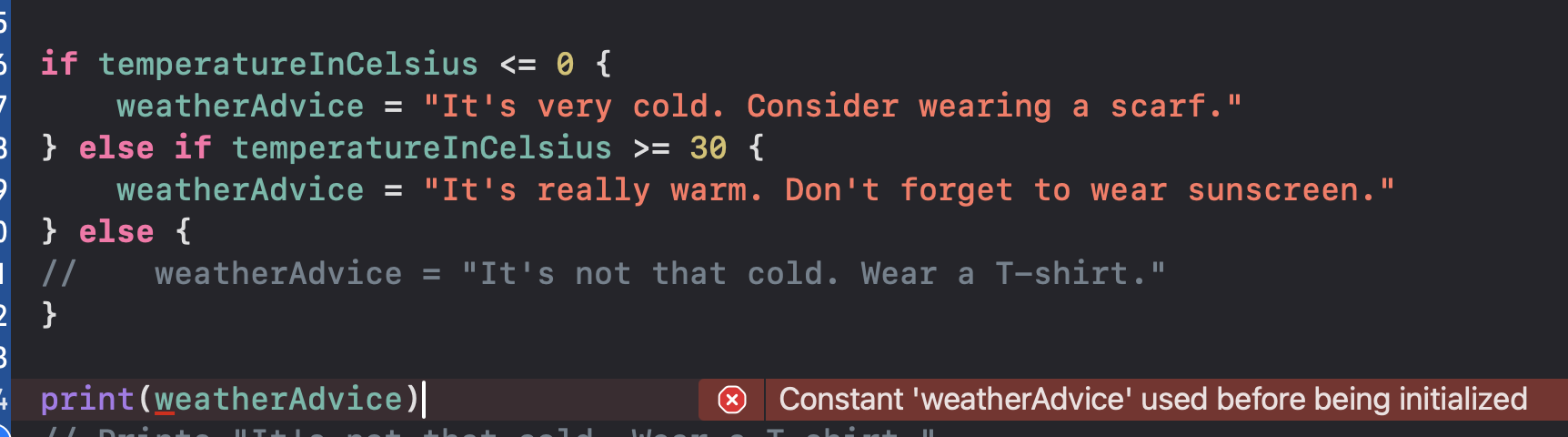 let weatherAdvice = if temperatureInCelsius <= 0 {