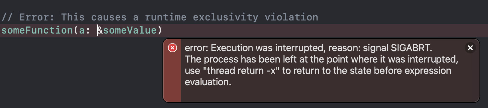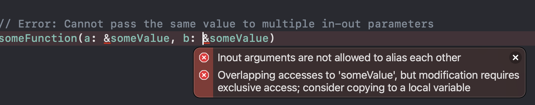 // Error: This causes a runtime exclusivity violation