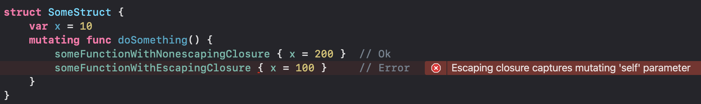 - 따라서 escaping 클로저는 값 타입에서 변경 가능한 self를 캡처할 수 없다.